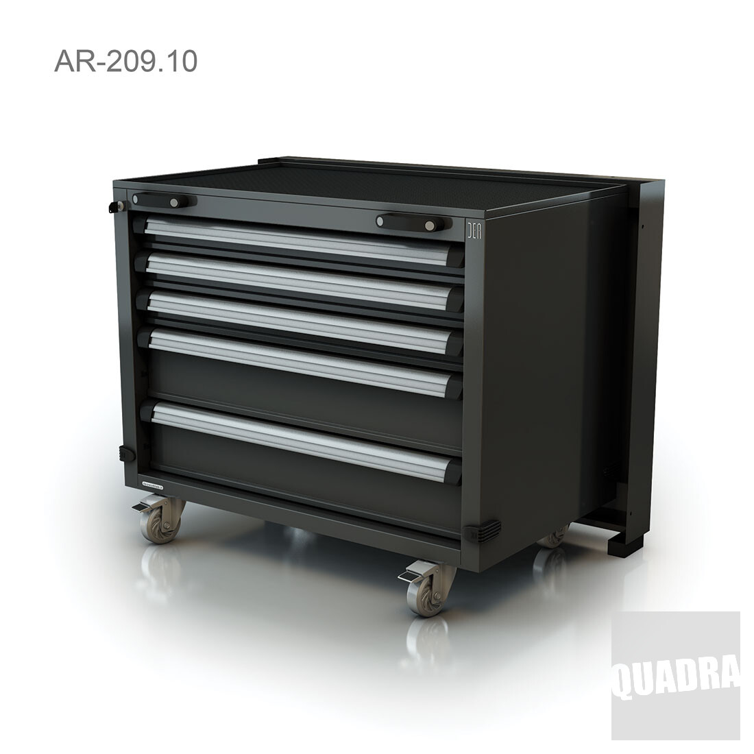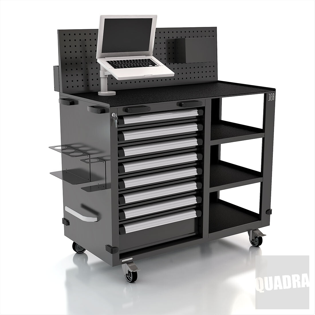 Caratterizzati da grande robustezza e da un ottimo impatto estetico come tutti gli arredi industriali a marchio DEA Worklab, i carrelli portautensili proposti da Quadra Planning sono molto stabili e solidi, e tollerano adeguatamente il peso del loro contenuto senza alcun rischio di sbilanciamento. Sono muniti di piedini regolabili e ruote rinforzate, pivotanti e dotate di freno, così che la loro movimentazione in officina sia facilitata. Ciascuno dei cassetti dei carrelli portautensili è testato per supportare dai 30 ai 100 chilogrammi di peso ed è alloggiato in una struttura interna estremamente robusta, perché saldata. È inoltre presente una maniglia ergonomica, anche etichettabile.