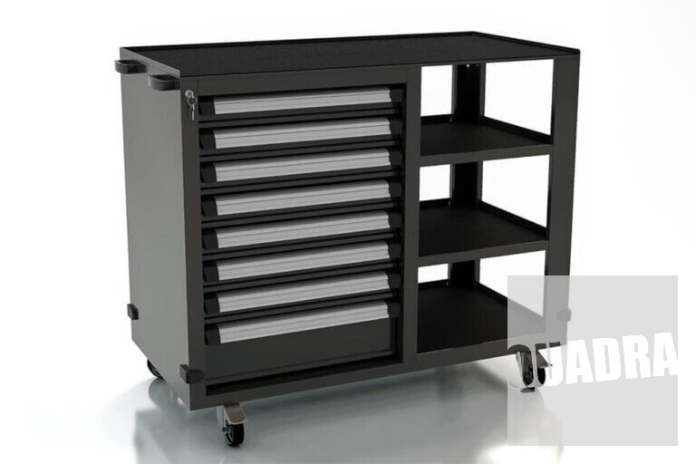 - Cassettiera a otto cassetti con guide da 45 kg di portata, ideale per lo stoccaggio di utensili anche pesanti.